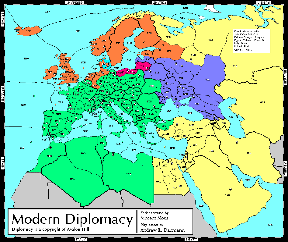 There is a purity to Diplomacy, and I find myself only really enjoying a variant map when it is created with restraint and respect towards the game. The most certain way of doing that is to hew close to the pure line I define here while also choosing the theme of the map with imagination and zest. Any peculiarities or changes to the rules are such that I’m going to scrutinize them very carefully, they have to justify themselves to me with utmost force. Such will probably cause me to pick some other map to play, unless the changes to the rules represent a strong and fruitful direction in exploring the universal rules-set behind Calhamer Diplomacy.