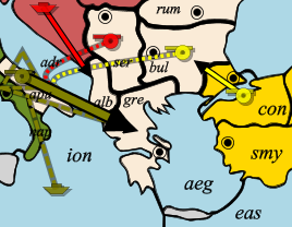 The optimal final position of this opening involves utter destruction of Turkey and a victorious Italo-Austrian alliance with a dominant Italy landing a Lepanto attack in Turkey in -03. Of course this is a pipe dream at a table you don’t control completely, so luckily the Greek opening is pretty flexible: you’ll have an army hanging around in Italy that you can use for a surprise stab against Austria, for instance. Or you can land that army in Greece instead of Anatolia and use the weakened Turk as a puppet; once he loses that Bulgarian army in the -02 spring attack, he should by rights be scared as hell. A lot depends on what Russia does, while the rest is up to the Austrian’s attitude. The Italian ideal scenario has Russia attack Austria in -03, when Italy has a believable Lepanto going. This will keep the Austrian occupied and allow the Italian to build a lead by taking Tunis and some Turkish SC to complement Greece and Bulgaria; builds can then be used to strangle the Austrian, who presumably won’t be too belligerent about the Italian as long as the full force of the Russian empire is on him. The Russian might also want to get into the Turkish split, but he should be easy enough to redirect by telling him that he can take Austrian SCs such as Rumania, while Italy takes Anatolia entire. It’s not inconseivable for Italy to make Russia a partner of some sort after Turkey and Austria are history, even.