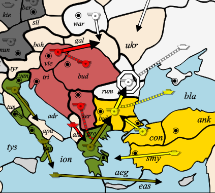 This is the beautiful part: once it’s -02 spring and you’re in Greece, you get to choose your allies. Both Turkey and Austria think that you’re an ally or hope that you’ll be an ally, and you haven’t made any promises that would’ve contradicted your actual moves, so your credibility is high on both parts. What’s more important, if you’ve worked together with Austria so far, you have a pretty good move for suckering Turkey and dealing a serious blow on your most deadly enemy, the Sultan.