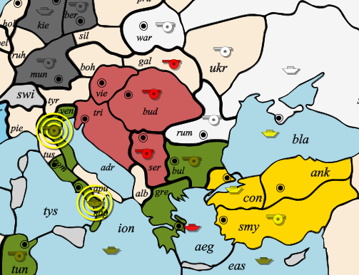 Italy has a dearth of feasible early targets on the Calhamer board; only Tunis is an obvious Italian gain during the first year. However, I myself greatly prefer the less certain early gain of Greece. Although Greece is just as far from the Italian Naples as Tunis, it’s also available to others – both Turkey and most especially Austria have some claim to this SC. A further problem is the fact that Italy can’t take both the certain Tunis and uncertain Greece during the same year, meaning that going for Greece early is an uncertain choice that might end up with you gaining no build at all.